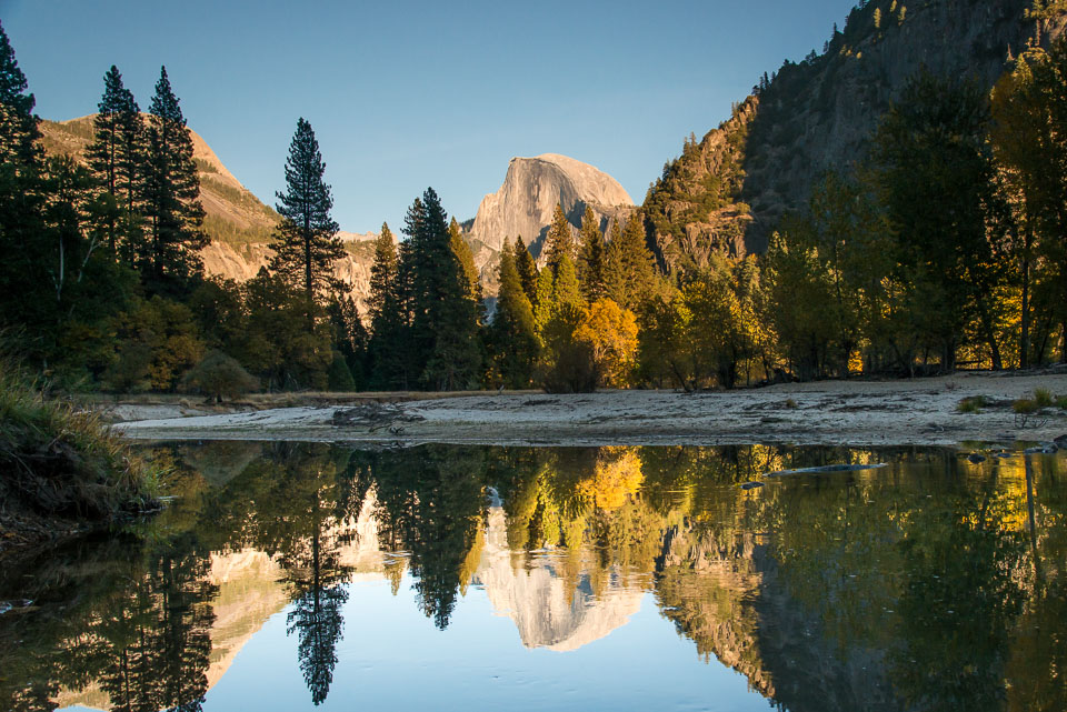 Half Dome with fall colors and reflection
